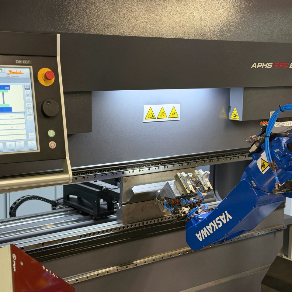 W pełni zintegrowane, zrobotyzowane stanowisko do gięcia blach. Projekt opiera się na synergii zaawansowanych technologii od liderów branży: Arama, Yaskawa oraz Metalix. Sercem systemu jest cele IntelliBend-M, która redefiniuje wydajność i precyzję w procesach obróbki plastycznej.