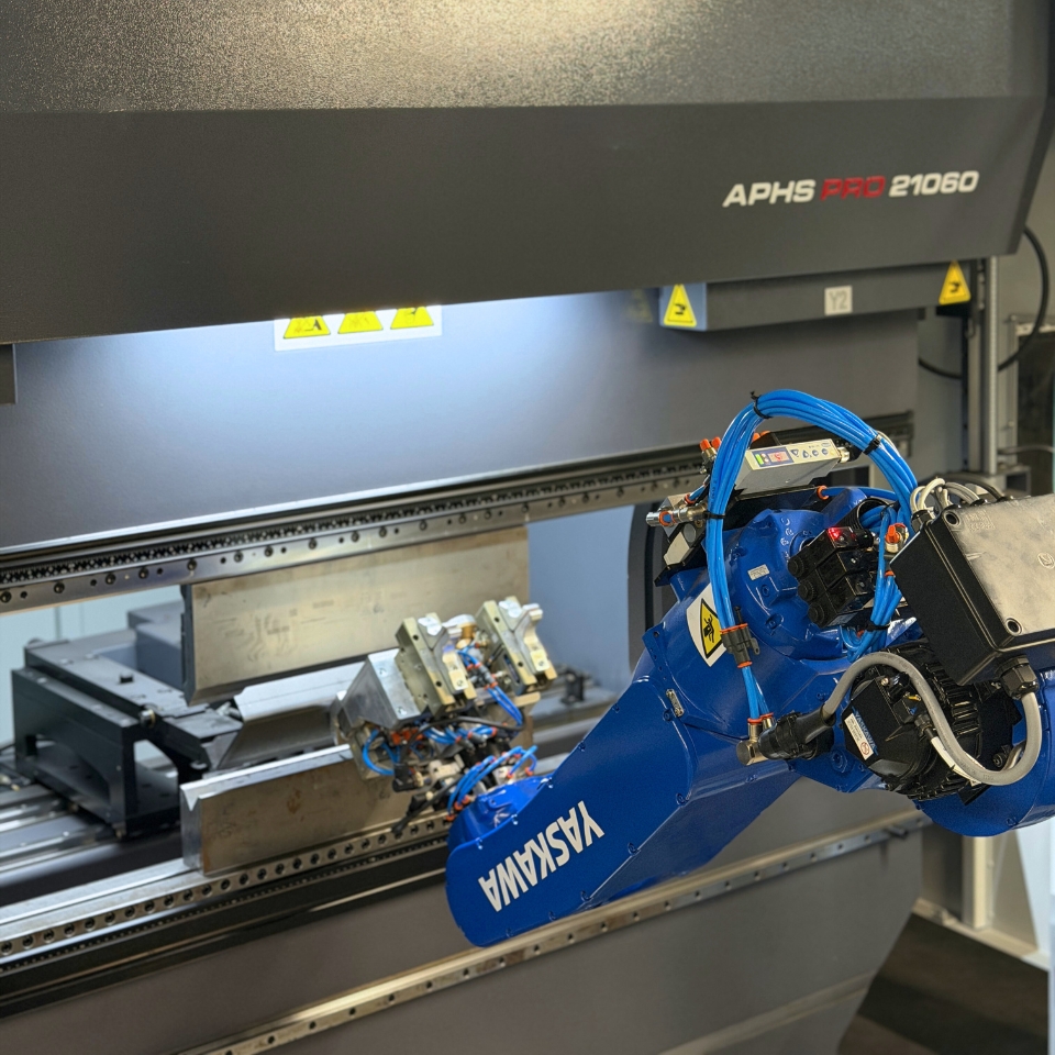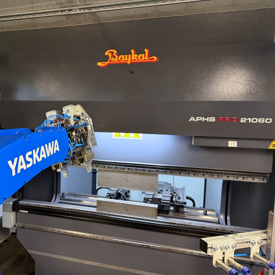 – Robot przemysłowy YASKAWA GP25: 6-osiowy robot o udźwigu do 25 kg. Model ten został stworzony do szybkich i precyzyjnych operacji przenoszenia oraz montażu. W naszej aplikacji odpowiada za pełną obsługę prasy – od pobrania arkusza, przez manipulację w trakcie gięcia, aż po odłożenie gotowego elementu.